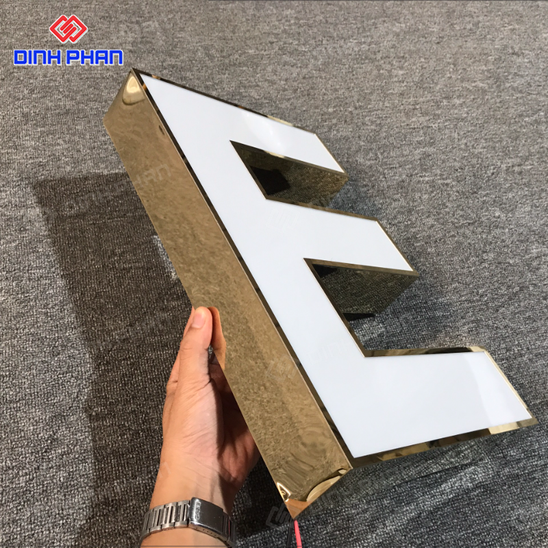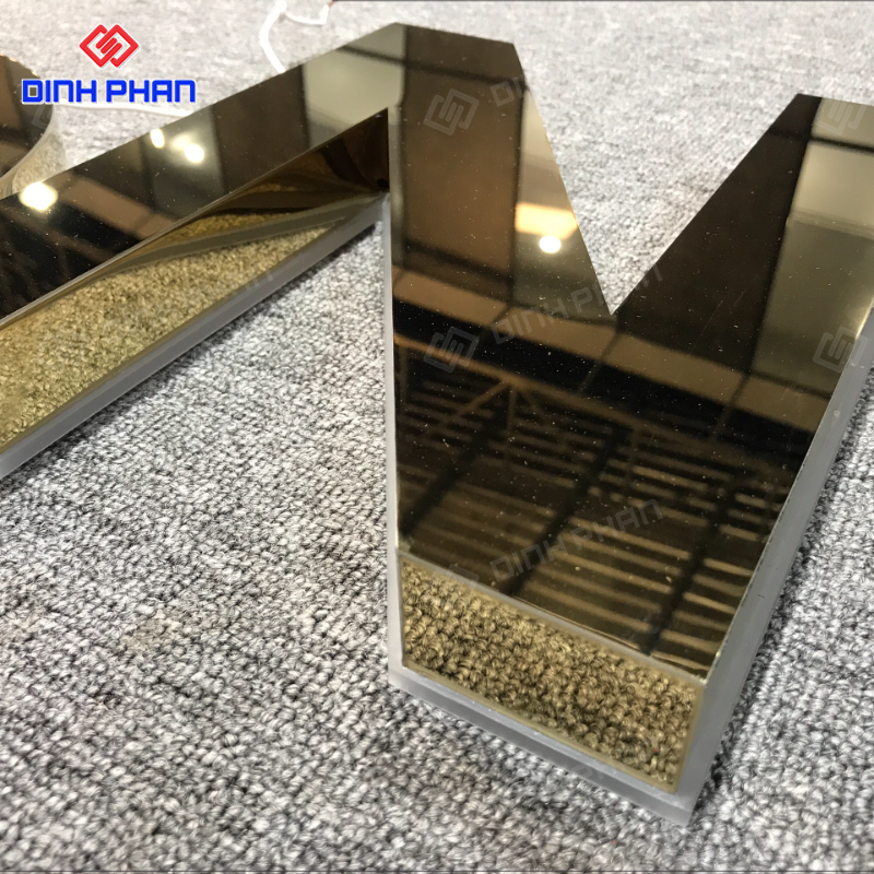 Đây là dạng chữ nổi được gia công từ vật liệu inox cao cấp, bề mặt xử lý đánh bóng tạo hiệu ứng phản chiếu như gương. Nhờ lớp mạ màu vàng sáng, sản phẩm mang lại cảm giác sang trọng, tinh tế và thường xuất hiện trong logo công ty, bảng tên thương hiệu, quầy lễ tân hoặc mặt tiền showroom. Chất liệu inox giúp chữ có độ cứng cáp, chống oxy hóa và giữ màu tốt trong nhiều điều kiện môi trường khác nhau.