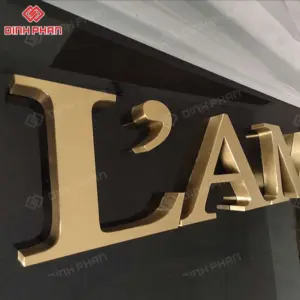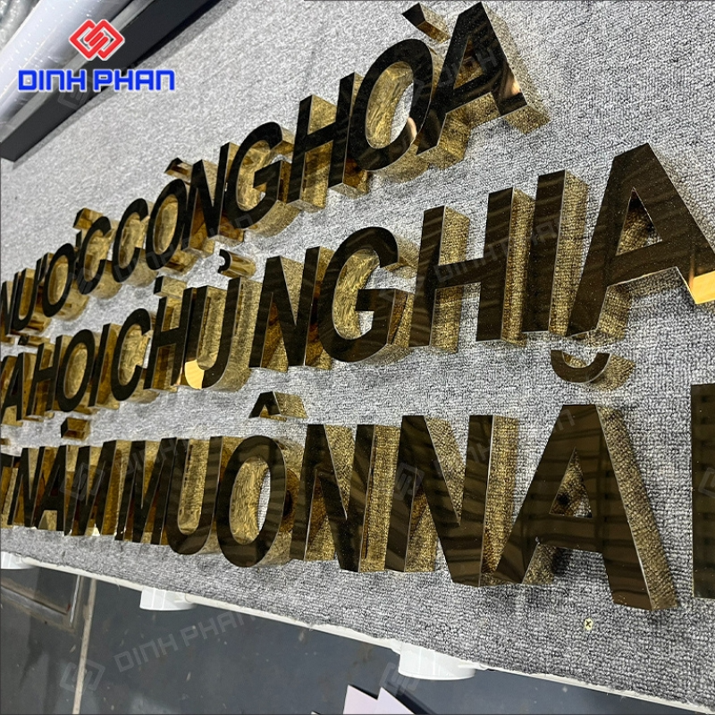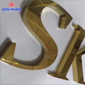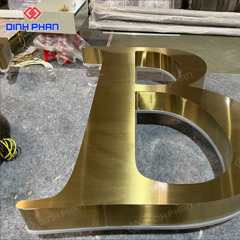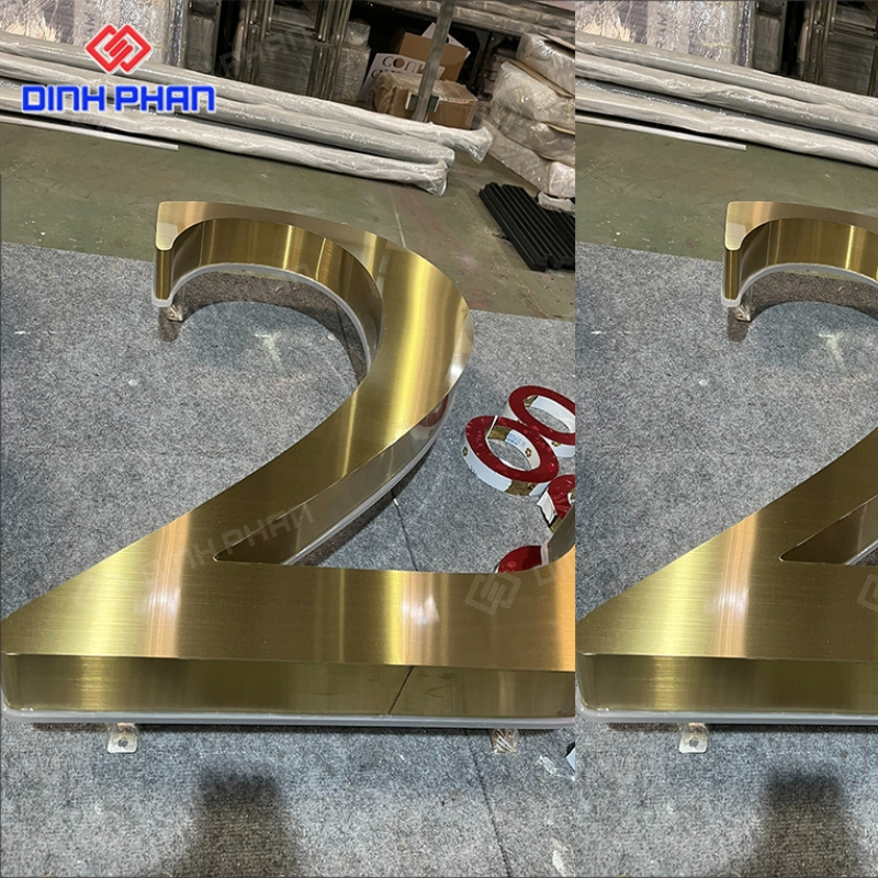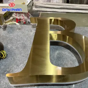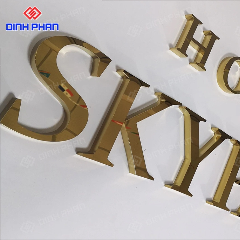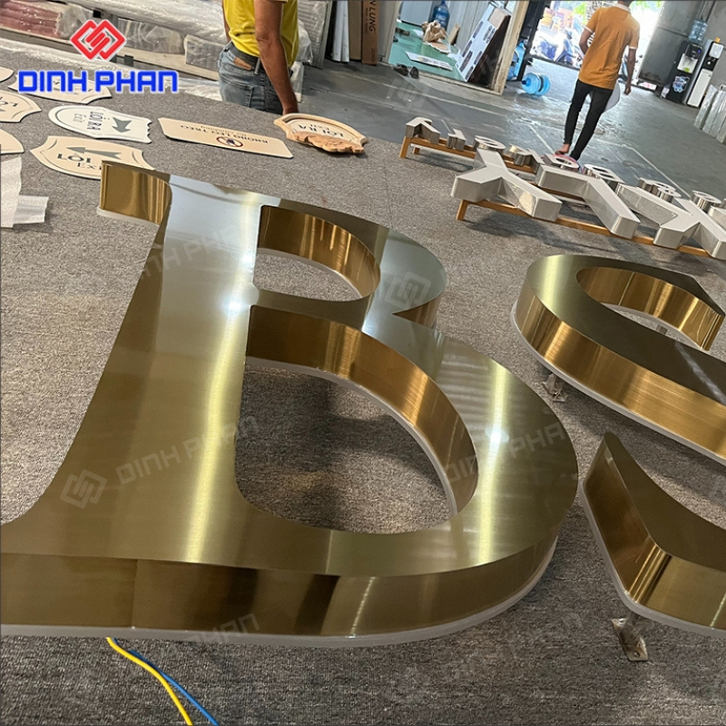 Đây là dạng chữ quảng cáo được gia công từ thép không gỉ, bề mặt xử lý mạ hoặc phủ màu vàng bằng công nghệ hiện đại như PVD, sơn tĩnh điện hoặc đánh bóng gương. Nhờ chất liệu nền bền bỉ kết hợp màu sắc sang trọng, loại chữ này thường xuất hiện tại mặt tiền cửa hàng, sảnh khách sạn, showroom, spa hay văn phòng cao cấp. Kiểu dáng đa dạng từ chữ nổi phẳng, chữ uốn chân, cho đến chữ gắn đèn LED, giúp đáp ứng nhiều phong cách thiết kế khác nhau.